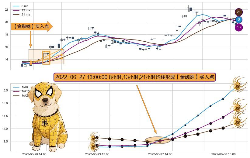 形态多维评估: ⚀ 2022-06-27 13:00:00小时显现 8小时-13小时-21小时均线 【金蜘蛛】买入点 看多信号,后市看涨,买入