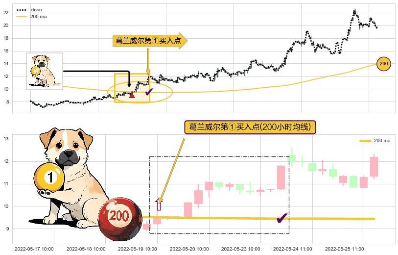 形态多维评估: ⚀ 2022-05-19 10:00:00-小时显现 葛兰威尔均线 200小时均线 第买①入点 走势反转见底信号,后市看涨,买进信号