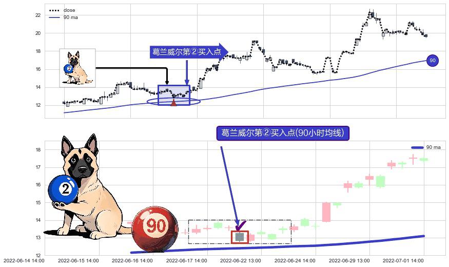 形态多维评估: ⚀ 2022-06-21 13:00:00-小时显现 葛兰威尔均线 90小时均线 第②买入点 上升趋势的中继信号,后市看涨,买进信号