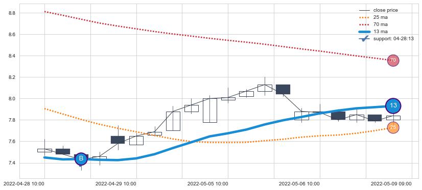 上涨趋势04-28 10:00-05-09 09:00,均线13确认关键支撑1处