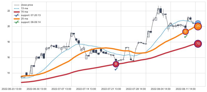 上涨趋势06-23 13:00-08-11 14:00,均线25, 70确认关键支撑2处