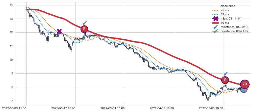 下跌趋势03-03 11:00-05-10 13:00,均线70确认关键阻力2处