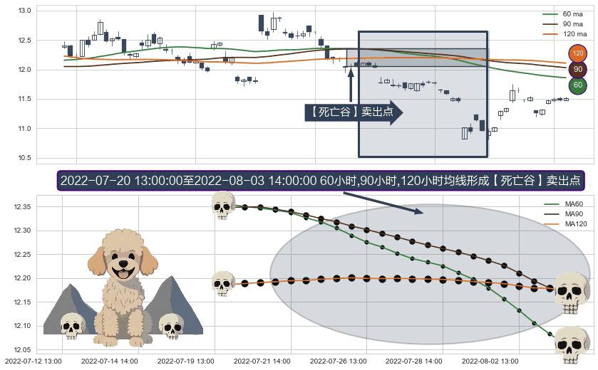 ⚀ 2022-07-20 14:00:00-小时至2022-08-03 14:00:00-小时显现 60小时-90小时-120小时均线 【死亡谷】卖出点 看空信号,后市看跌,卖出