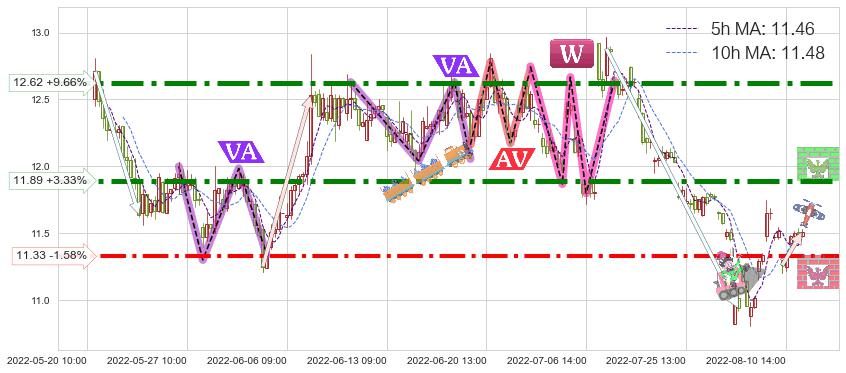 ♘ 阻力价格位11.89,可信任强度85.77%,距离最后交易2022-08-12 14:00形成的收盘价格11.51相差 +3.33%