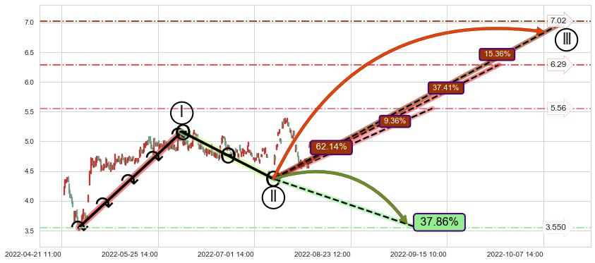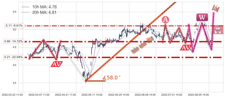 ♘ 支撑价格位5.11,可信任强度59.65%,距离最后交易2022-08-12 13:00形成的收盘价格5.47相差 -6.61%