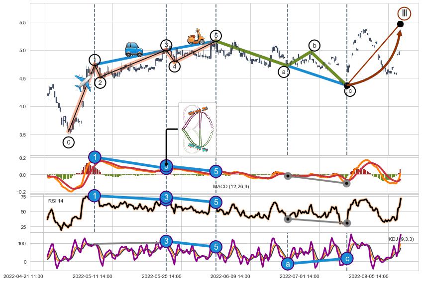 ➣ 1,3,5驱动浪MACD, RSI, KDJ走势都出现【常规背离】反转信号增强
