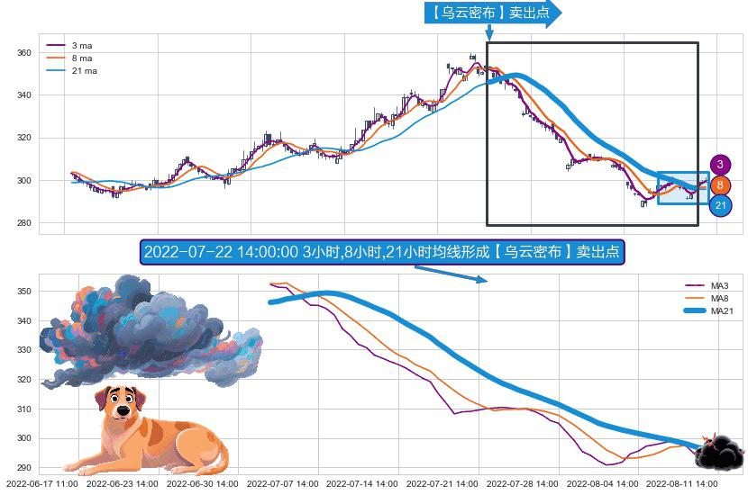 形态多维评估: ⚀ 2022-07-04 14:00:00小时-2022-08-11 13:00:00小时显现 3小时-8小时-21小时均线 【乌云密布】卖出点 看空信号,后市看跌,卖出
