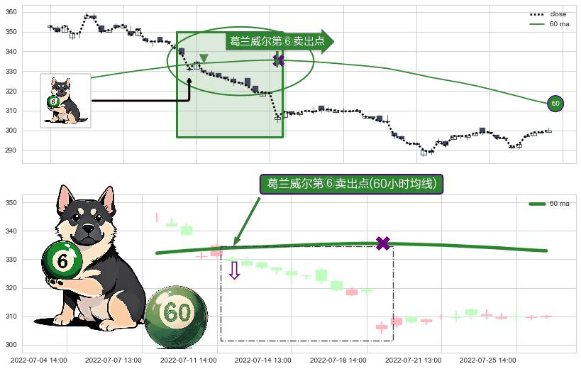 形态多维评估: ⚀ 2022-07-12 13:00:00-小时显现 葛兰威尔均线 60小时均线 第⑥卖出点 走势反转见顶信号,后市看跌,卖出信号
