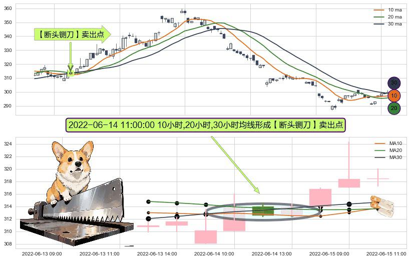 形态多维评估: ⚀ 2022-06-14 11:00:00小时显现 10小时-20小时-30小时均线 【断头铡刀】卖出点 看空信号,后市看跌,卖出