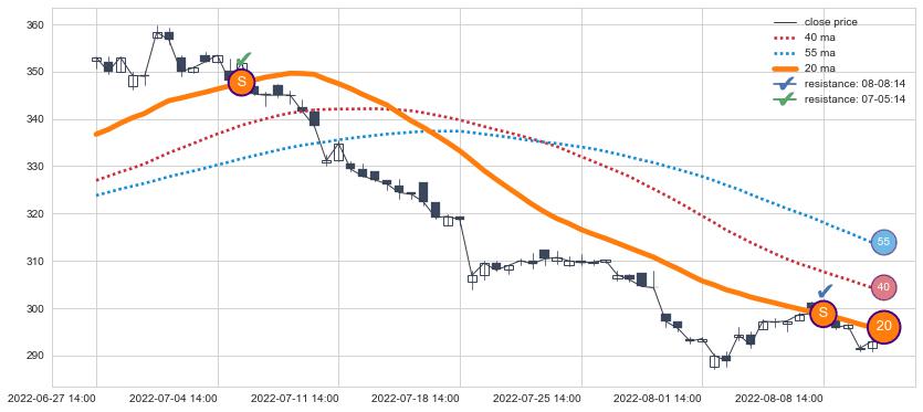下跌趋势06-27 14:00-08-10 14:00,均线20确认关键阻力2处