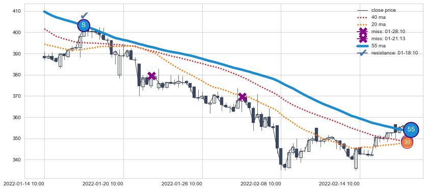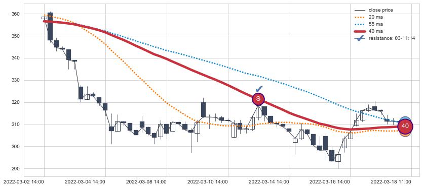 下跌趋势03-02 14:00-03-18 11:00,均线40确认关键阻力1处