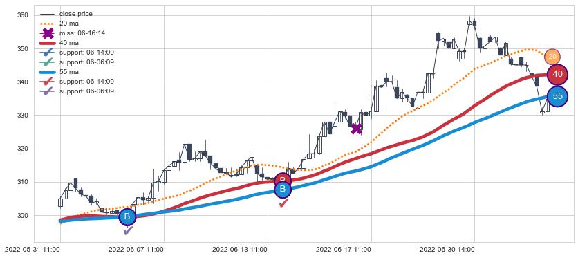 上涨趋势05-31 11:00-07-11 14:00,均线40, 55确认关键支撑2处