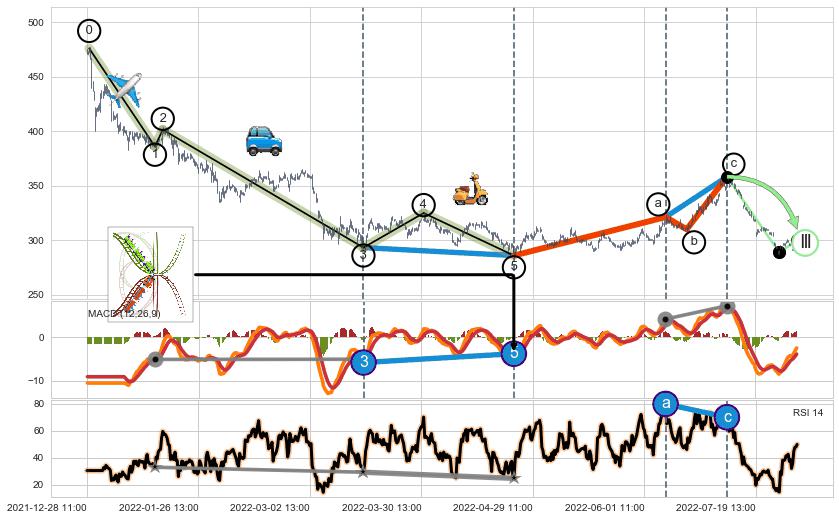 ➣ 第一, 三, 五浪下跌动能逐渐【衰弱变小】,趋势呈现不稳迹象