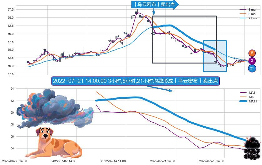 形态多维评估: ⚀ 2022-07-11 14:00:00小时-2022-08-02 13:00:00小时显现 3小时-8小时-21小时均线 【乌云密布】卖出点 看空信号,后市看跌,卖出