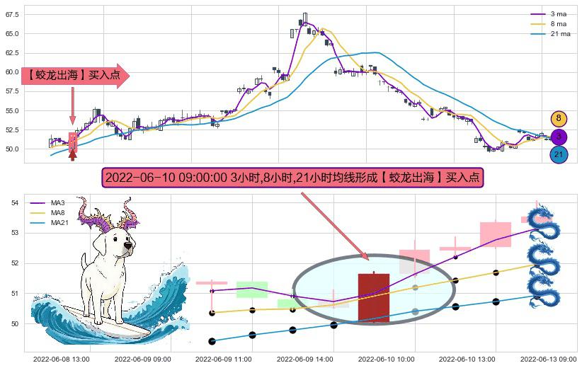 形态多维评估: ⚀ 2022-06-10 09:00:00小时显现 3小时-8小时-21小时均线 【蛟龙出海】买入点 看多信号,后市看涨,买入