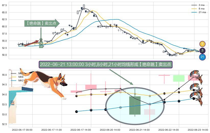 形态多维评估: ⚀ 2022-06-21 13:00:00小时显现 3小时-8小时-21小时均线 【绝命跳】卖出点 看空信号,后市看跌,卖出