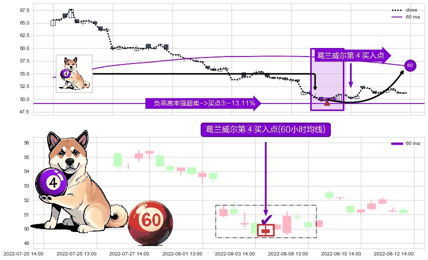 形态多维评估: ⚀ 2022-08-04 13:00:00-小时显现 葛兰威尔均线 60小时均线 第④买入点 下降趋势均值回复的短线反弹信号,后市看涨,买进信号