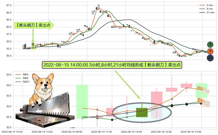 形态多维评估: ⚀ 2022-06-15 14:00:00小时显现 3小时-8小时-21小时均线 【断头铡刀】卖出点 看空信号,后市看跌,卖出