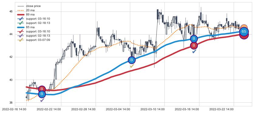 上涨趋势02-16 14:00-03-23 13:00,均线65, 89确认关键支撑3处