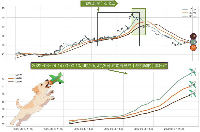 形态多维评估: ⚀ 2022-06-15 14:00:00小时-2022-07-08 14:00:00小时显现 10小时-20小时-30小时均线 【战机起航】卖出点 看空信号,后市看跌,卖出
