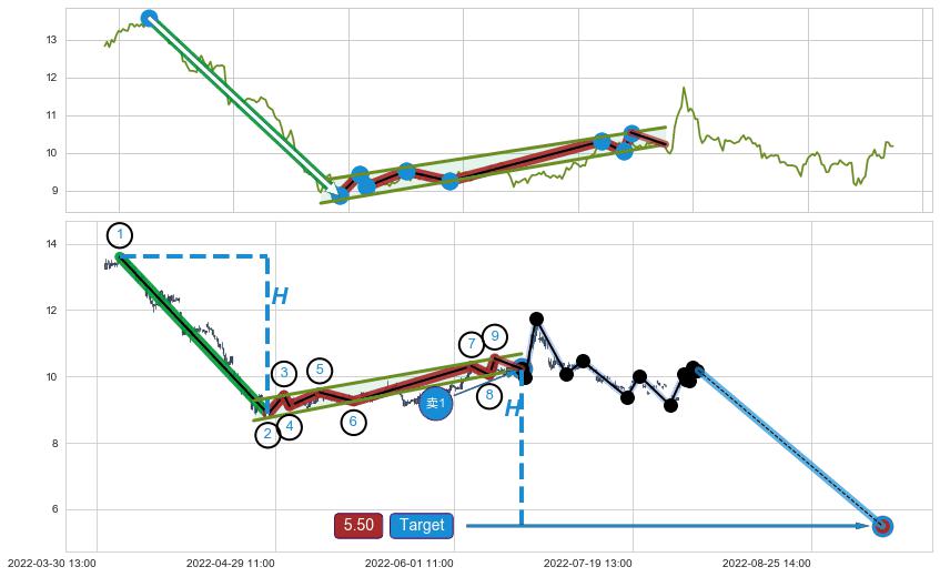 从2022-07-15 14:00至2022-08-12 14:00,共包含41个小时,阶段股价上涨8.78%,阶段股价变动位移路程比: 1 : 5