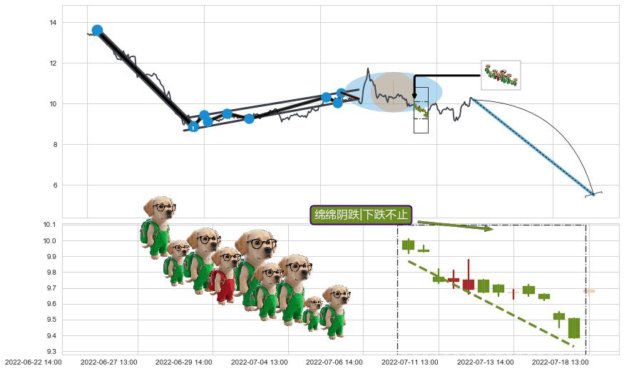 从2022-06-14 11:00至2022-07-15 14:00,共包含58个小时,阶段股价下跌-5.46%,阶段股价变动位移路程比: 1 : 11