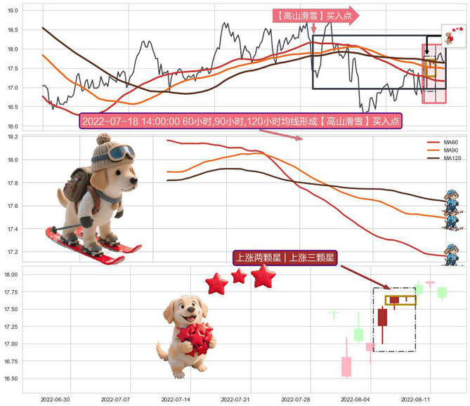 ➣ 2022-06-21 14:00:00小时-2022-08-12 14:00:00小时显现 60小时-90小时-120小时均线 【高山滑雪】买入点 看多信号,后市看涨,买入