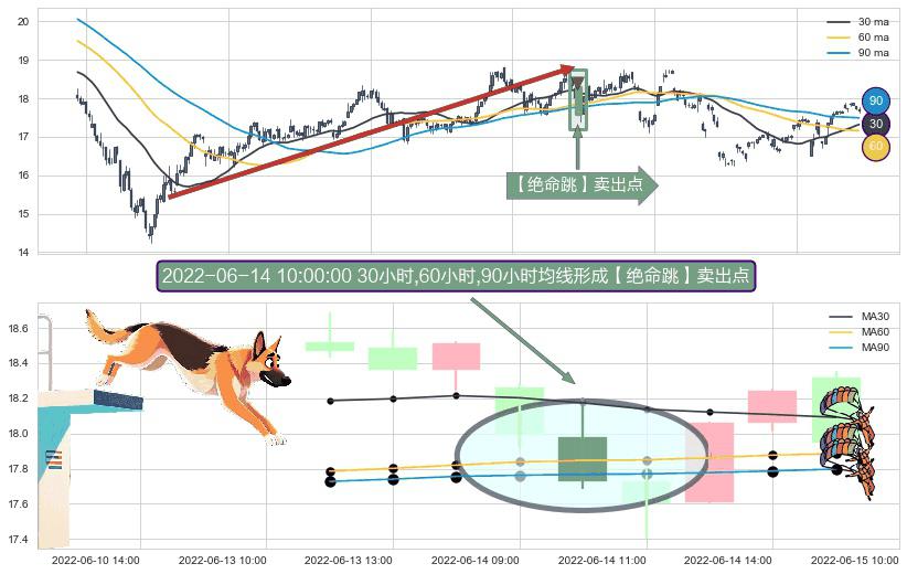⚀ 2022-06-14 10:00:00小时显现 30小时-60小时-90小时均线 【绝命跳】卖出点 看空信号,后市看跌,卖出