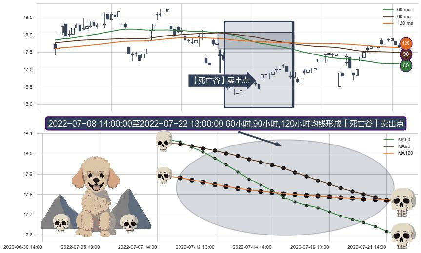 ⚀ 2022-07-11 13:00:00-小时至2022-07-22 13:00:00-小时显现 60小时-90小时-120小时均线 【死亡谷】卖出点 看空信号,后市看跌,卖出