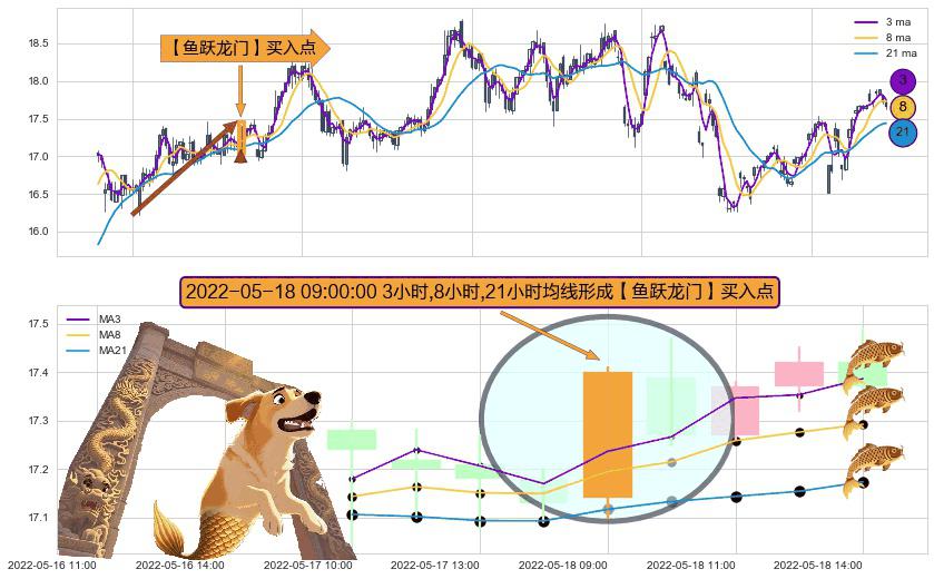 ⚀ 2022-05-18 09:00:00小时显现 3小时-8小时-21小时均线 【鱼跃龙门】买入点 看多信号,后市看涨,买入
