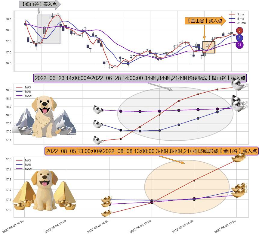 ⚀ 2022-08-05 14:00:00-小时至2022-08-08 13:00:00-小时显现 3小时-8小时-21小时均线 【金山谷】买入点 其再次确认了买入信号,可靠性更强,买入