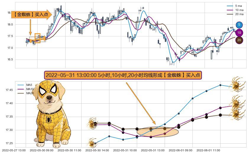 ⚀ 2022-05-31 13:00:00小时显现 5小时-10小时-20小时均线 【金蜘蛛】买入点 看多信号,后市看涨,买入
