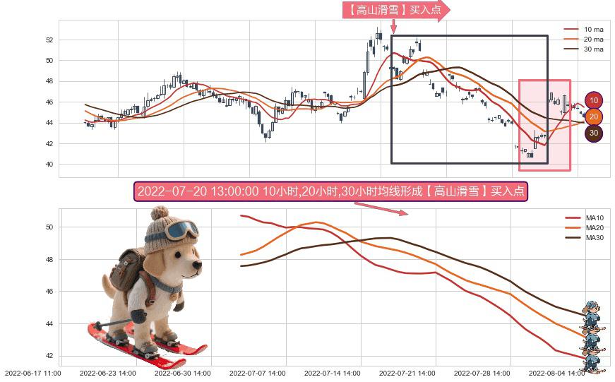 ⚀ 2022-07-04 14:00:00小时-2022-08-04 14:00:00小时显现 10小时-20小时-30小时均线 【高山滑雪】买入点 看多信号,后市看涨,买入