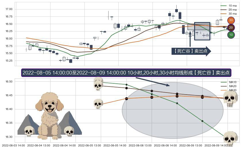 ⚀ 2022-08-08 13:00:00-小时至2022-08-09 14:00:00-小时显现 10小时-20小时-30小时均线 【死亡谷】卖出点 看空信号,后市看跌,卖出