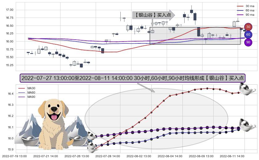 ⚀ 2022-07-27 14:00:00-小时至2022-08-11 14:00:00-小时显现 30小时-60小时-90小时均线 【银山谷】买入点 看多信号,后市看涨,买入