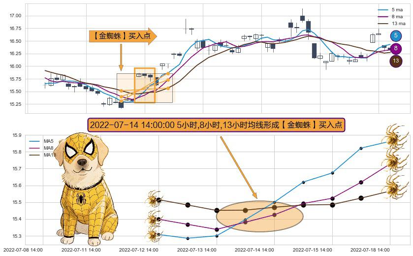 ⚀ 2022-07-14 14:00:00小时显现 5小时-8小时-13小时均线 【金蜘蛛】买入点 看多信号,后市看涨,买入