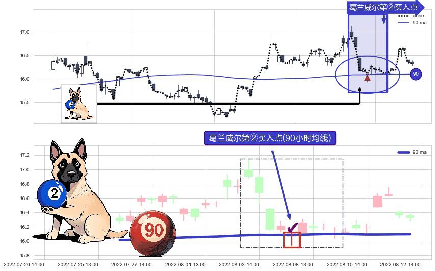 ⚀ 2022-08-05 13:00:00-小时显现 葛兰威尔均线 90小时均线 第②买入点 上升趋势的中继信号,后市看涨,买进信号
