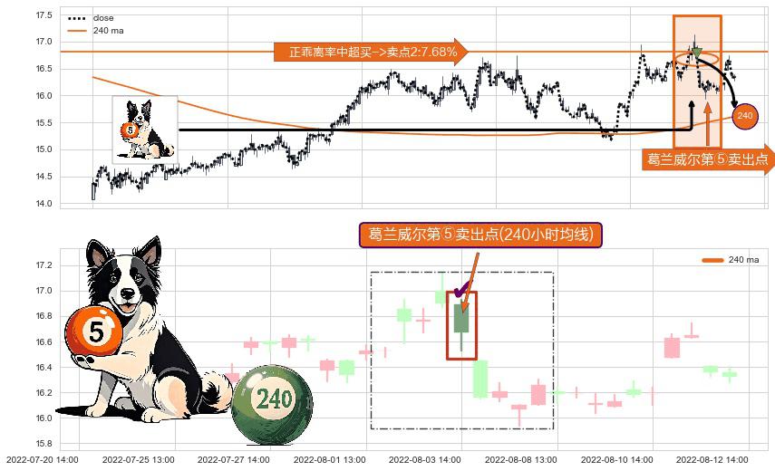⚀ 2022-08-03 14:00:00-小时显现 葛兰威尔均线 240小时均线 第⑤卖出点 上升趋势均值回复的短线回落信号,后市看跌,卖出信号