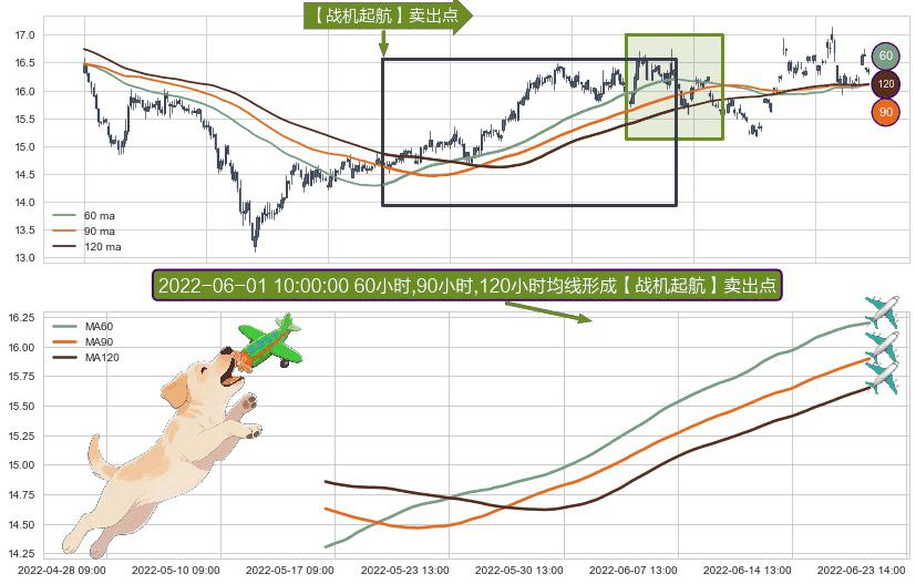 ⚀ 2022-05-16 13:00:00小时-2022-06-17 14:00:00小时显现 60小时-90小时-120小时均线 【战机起航】卖出点 看空信号,后市看跌,卖出