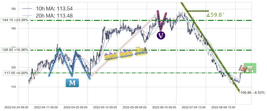 ♘ 阻力价格位117.05,可信任强度44.52%,距离最后交易2022-08-12 14:00形成的收盘价格116.82相差 +0.20%