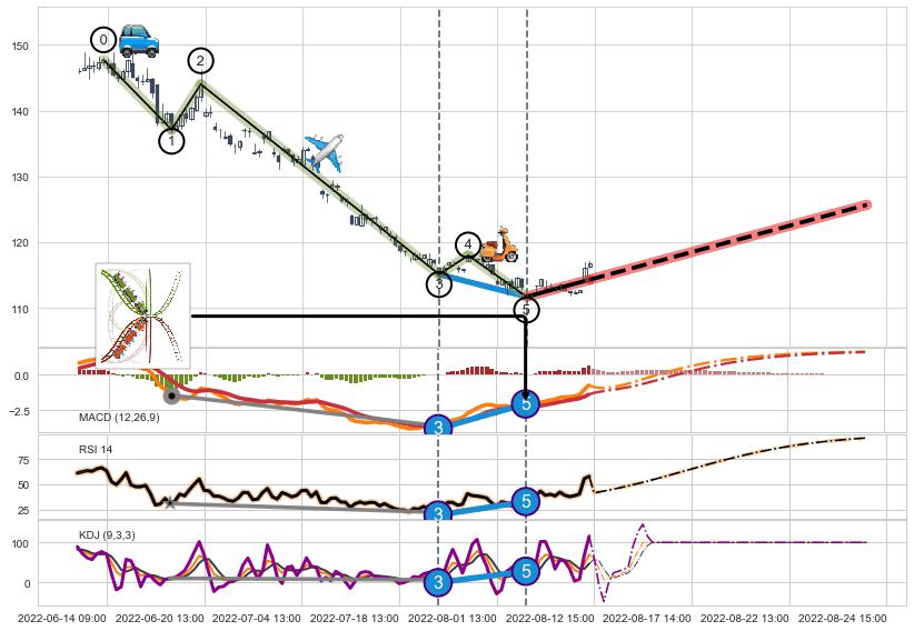 ➢ 1,3,5驱动浪MACD, RSI, KDJ走势都出现【常规背离】反转信号增强