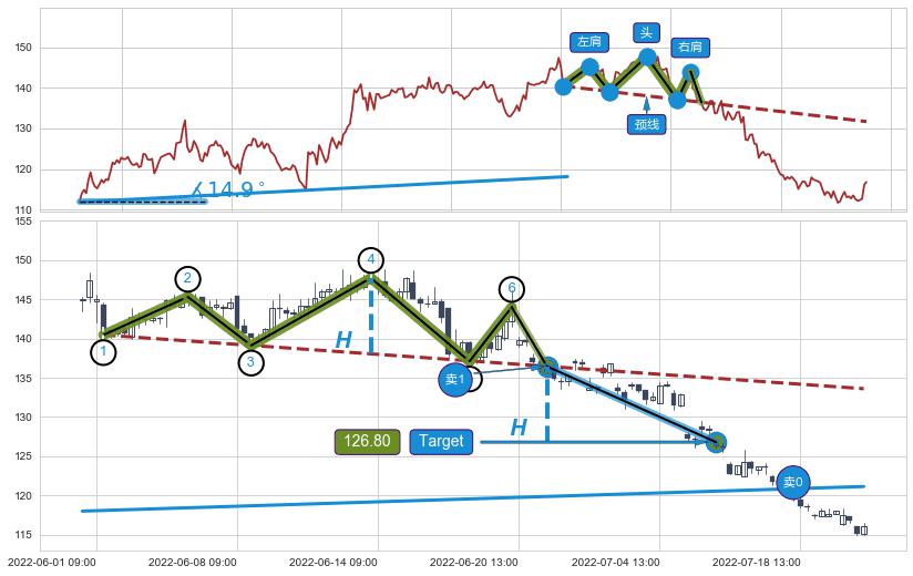 ➣ 【已确认突破】头肩顶 起点:06-01:10,突破点:06-22:13,形态共64交易小时