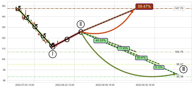 从2022-05-31 14:00至2022-08-12 13:00,共包含140个小时,阶段股价下跌-22.94%,阶段股价变动位移路程比: 1 : 5,下跌趋势角度: 59.8
