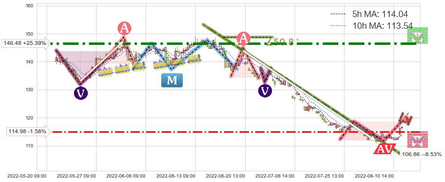 ♘ 支撑价格位114.98,可信任强度67.13%,距离最后交易2022-08-12 14:00形成的收盘价格116.82相差 -1.58%