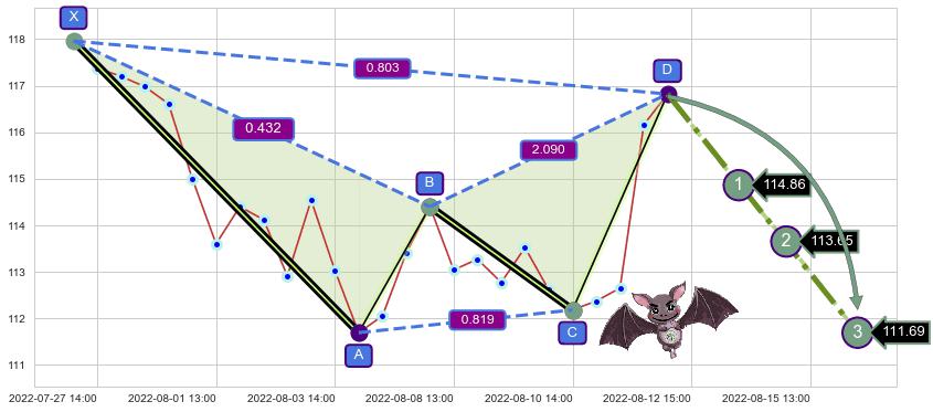 ➣ 已完成【蝙蝠】形态起点X: 07-27:13, 终点D: 08-12:14, 共26交易小时