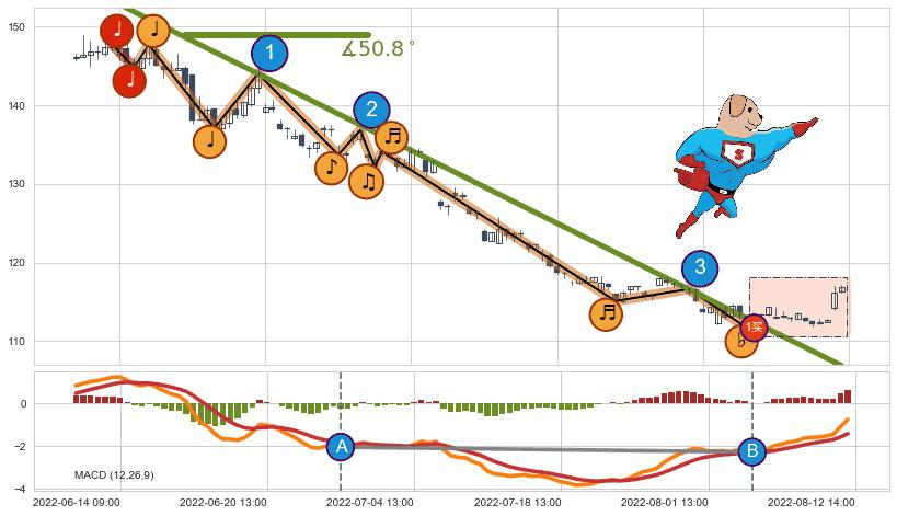 从2022-06-14 11:00至2022-08-12 13:00,共包含97个小时,阶段股价下跌-21.34%,阶段股价变动位移路程比: 1 : 4,下跌趋势角度: 50.1