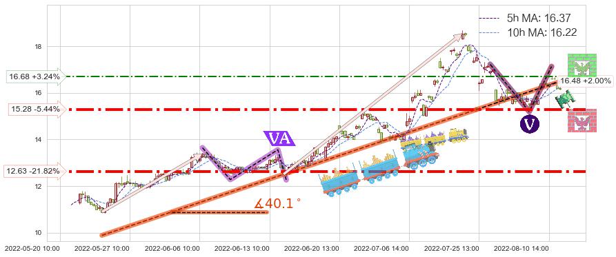 ➣ 2022-05-25 10:00-2022-07-22 14:00上升趋势存在反转[风险],虽然原上升趋势的支撑位(16.48)已破位,但其支撑效果尚存,原上升趋势角度: 40.1˚