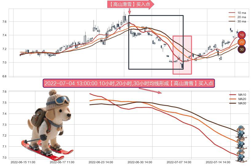 形态多维评估: ⚀ 2022-06-20 14:00:00小时-2022-07-15 14:00:00小时显现 10小时-20小时-30小时均线 【高山滑雪】买入点 看多信号,后市看涨,买入