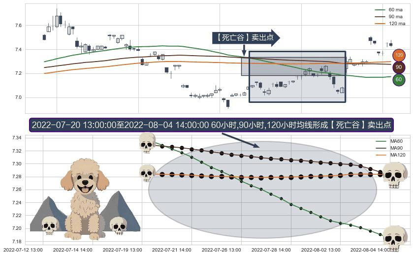形态多维评估: ⚀ 2022-07-20 14:00:00-小时至2022-08-04 14:00:00-小时显现 60小时-90小时-120小时均线 【死亡谷】卖出点 看空信号,后市看跌,卖出