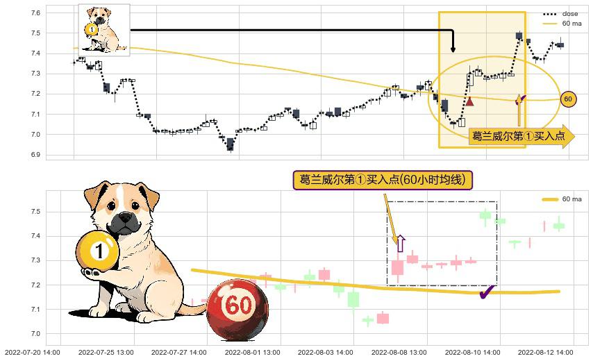 形态多维评估: ⚀ 2022-08-05 13:00:00-小时显现 葛兰威尔均线 60小时均线 第买①入点 走势反转见底信号,后市看涨,买进信号
